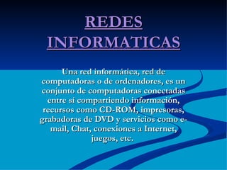 Este documento describe los diferentes tipos de redes informáticas, incluyendo redes de área local (LAN), redes metropolitanas (MAN), redes amplias de área (WAN) e Internet. Explica los conceptos clave como cliente, servidor, router, switch, punto de acceso y la configuración básica de una red LAN, incluyendo la dirección IP, máscara de subred y puerta de enlace.