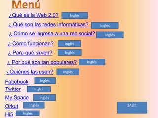 El documento describe las redes sociales, incluyendo qué son, cómo funcionan y para qué sirven. Explica que las redes sociales son comunidades en línea donde las personas con intereses comunes se conectan e interactúan. También describe algunas redes sociales populares como Facebook, Twitter, MySpace, Orkut y Hi5.