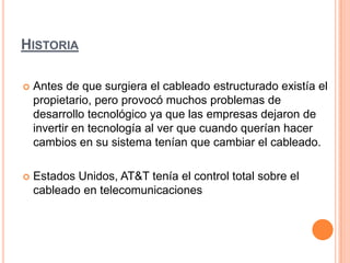 El cableado estructurado permite interconectar equipos activos de diferentes tecnologías para integrar sistemas de control. Antes no existía este cableado estructurado y flexible, por lo que cuando las empresas querían hacer cambios tecnológicos tenían que cambiar todo el cableado, lo que desincentivó la inversión. Estados Unidos solía tener un solo proveedor de cableado, AT&T, que controlaba las telecomunicaciones.