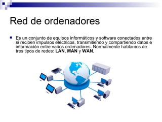 Una red informática conecta equipos informáticos que comparten e intercambian datos e información. Existen tres tipos principales de redes: las redes de área local (LAN) que conectan equipos dentro de una pequeña área geográfica como una oficina; las redes de área metropolitana (MAN) que cubren áreas más grandes usando fibra óptica; y las redes de largo alcance (WAN) que conectan dispositivos a través de grandes distancias e incluso a nivel mundial. Los dispositivos como