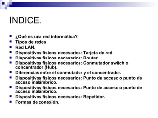 Una red informática es un sistema formado por varios equipos que pueden compartir datos hardware o software. Existen diferentes tipos de redes según su extensión, como las LAN, MAN y WAN. Una red LAN requiere dispositivos como tarjetas de red, routers, conmutadores o concentradores, puntos de acceso inalámbricos y repetidores. El conmutador lee la información que recibe y la redirige solo al equipo destinatario, mientras que el concentrador transmite los datos a todos los equipos.