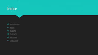 Este documento describe los diferentes tipos de redes de comunicación como LAN, WAN y MAN. Explica que una LAN conecta ordenadores dentro de un edificio o área pequeña usando cableado privado, una WAN conecta áreas más grandes como países usando cableado transoceánico o satélites, y una MAN conecta una ciudad o distrito usando estándares como SONET/SDH sobre fibra óptica. El propósito de las redes es permitir la comunicación y compartir de información entre computadoras.