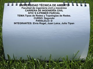 Este documento presenta los objetivos de aprendizaje sobre tipos de redes y topologías de redes para un curso de ingeniería civil. Los objetivos son conocer lo que es una topología, reconocer las diferencias entre redes, y conocer lo que son redes. El documento incluye un índice general con secciones sobre objetivos, resumen, desarrollo, conclusiones y bibliografía.