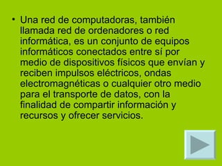 Una red informática conecta dispositivos electrónicos a través de cables o señales inalámbricas para compartir información y recursos. Existen diferentes tipos de redes según su área de cobertura, como las redes personales, locales, metropolitanas y globales. Las redes se pueden organizar topológicamente en anillo, bus o estrella, siendo esta última la más común por su fiabilidad al afectar solo al nodo desconectado en caso de fallo.