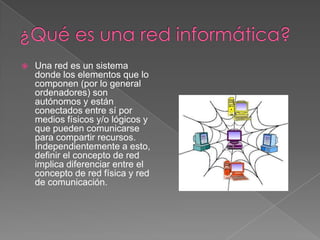 Una red es un sistema donde elementos como ordenadores están conectados entre sí para compartir recursos. Las redes se clasifican por su tamaño (LAN, MAN, WAN) y forma de conexión (lineal, en bus, en estrella, en anillo). Permiten compartir internet, impresoras y archivos. Las redes inalámbricas usan ondas electromagnéticas. Los estándares TCP/IP y OSI definen el funcionamiento de las redes actuales.