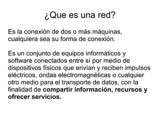 Este documento describe las redes informáticas y sus componentes básicos. Explica que una red es la conexión de dos o más máquinas para compartir recursos e información. Detalla los elementos necesarios para formar una red como hardware, software y protocolos. Finalmente, clasifica las redes por su alcance, relación funcional, topología física y otros criterios.