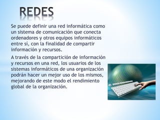 Una red informática conecta computadoras y equipos para compartir información y recursos, lo que permite a los usuarios de una organización usar los sistemas de manera más efectiva y mejorar el rendimiento general. Los servidores almacenan y comparten archivos, impresiones y aplicaciones a través de tarjetas de red, mientras que las estaciones de trabajo se conectan a los servidores para acceder a estos recursos compartidos. Las redes se clasifican por su tamaño físico, desde redes locales en un edificio hasta redes globales que se