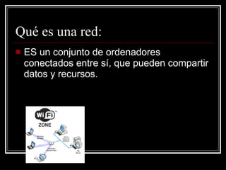 Una red informática conecta varios ordenadores para compartir datos y recursos. Las redes se clasifican por su tamaño (redes de área local o extensa) y nivel de acceso (Internet pública, intranet privada, o extranet entre intranets). En una red hay un servidor que proporciona recursos y servicios a los clientes conectados.