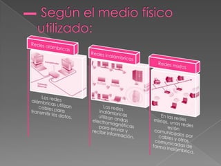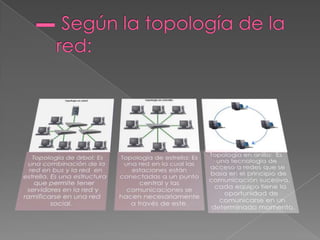 El documento describe diferentes tipos de redes según su tamaño, medio físico y topología. Las redes se clasifican como LAN (redes locales), MAM (redes metropolitanas), o WAN (redes amplias), dependiendo de su área geográfica. Las redes también se diferencian por si usan cables o tecnología inalámbrica, y por su topología de red como árbol, estrella o anillo. Además, explica dispositivos de red comunes como tarjetas de red, concentradores, routers y conmutadores, así