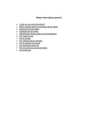 Este documento resume las características y clasificaciones de las redes informáticas. Explica que una red informática conecta dispositivos electrónicos para compartir recursos e información. Luego describe la evolución de las redes desde ARPANET en 1969 hasta Internet hoy en día. Finalmente, clasifica las redes de acuerdo a su capa, escala, método de conexión, relación funcional, topología, servicios y protocolos.