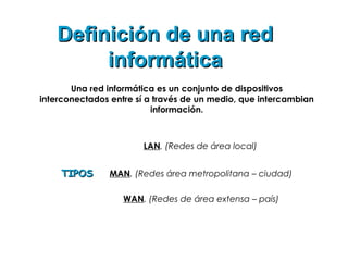 Una red informática conecta dispositivos a través de un medio para intercambiar información. Existen redes de área local (LAN), área metropolitana (MAN) y área extensa (WAN). El diseño de una LAN implica dispositivos hardware como routers, tarjetas de red y switches; instalación y conexión de cables; y configuración de la red mediante direcciones IP, máscaras de subred, puertas de enlace y servidores DNS.