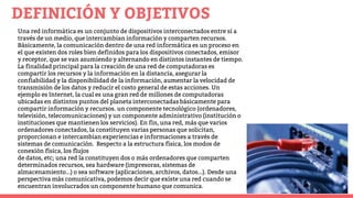 Una red informática es un conjunto de dispositivos interconectados que comparten información y recursos. Las redes permiten compartir recursos a distancia, mejorar la disponibilidad y velocidad de transmisión de datos. Un ejemplo es Internet, la cual conecta millones de computadoras globalmente.