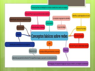 Este documento proporciona una introducción a los conceptos básicos de las redes informáticas, incluyendo la comunicación, protocolos, direcciones IP públicas y privadas, puerta de enlace, máscara de red, grupo de trabajo, DNS, dirección MAC y puertos. Explica cómo los dispositivos se comunican a través de una red y los componentes clave que hacen posible esa comunicación.