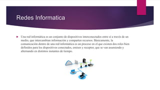 Este documento describe los conceptos básicos de las redes informáticas. Explica que una red informática es un conjunto de dispositivos interconectados que comparten información y recursos. Describe la estructura de las redes en tres niveles: software de aplicaciones, software de red y hardware de red. También define los diferentes tipos de dispositivos, medios, información y recursos involucrados en una red.