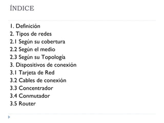 Este documento define las redes informáticas y describe los tipos principales de redes según su cobertura, medio de transmisión y topología. También explica los dispositivos clave para la conexión de equipos en una red, incluyendo tarjetas de red, cables, concentradores, conmutadores y routers. El protocolo TCP/IP se presenta como fundamental para la comunicación entre ordenadores en una red.