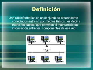 Una red informática es un conjunto de ordenadores conectados entre sí mediante cables o de forma inalámbrica que permiten el intercambio de información. Para que un grupo de ordenadores sea una red deben compartir hardware como impresoras y software como aplicaciones y archivos. Las redes se componen de software de aplicaciones y de red, y hardware de red como cables y adaptadores de red. Existen diferentes tipos de redes según su uso, propiedad, cobertura y forma geométrica de conexión entre ordenadores.