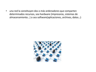 Una red informática conecta dos o más ordenadores que comparten recursos como hardware y software a través de medios físicos y lógicos. Las redes se clasifican por su área de cobertura como PAN, LAN, WLAN, CAN, MAN, WAN y VLAN, y utilizan diferentes tipos de medios como cables, ondas de radio o fibra óptica para la comunicación entre dispositivos.