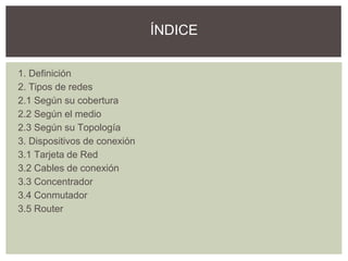 Este documento describe los conceptos básicos de las redes informáticas, incluyendo las definiciones de redes locales y sus tipos según su cobertura, medio de propagación y topología. También explica los dispositivos comunes de conexión como tarjetas de red, cables, concentradores, conmutadores y routers.