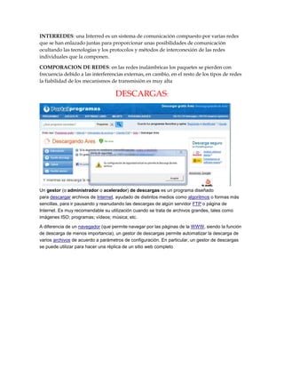 Este documento describe diferentes tipos de redes, incluyendo redes de área local (LAN), redes de área extensa, redes de área metropolitana, redes inalámbricas e interredes. También discute la comparación de fiabilidad entre redes inalámbricas y otras redes, así como el propósito y uso de gestores de descargas y redes sociales.