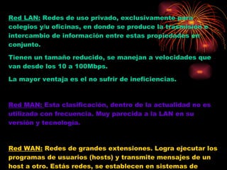 Una red LAN es una red privada de pequeño tamaño para una oficina o escuela que transmite información a velocidades de 10-100 Mbps. Una red MAN es similar a una LAN pero rara vez se usa hoy en día. Una red WAN se extiende a grandes distancias usando satélites y radio para transmitir información entre hosts en diferentes ubicaciones.