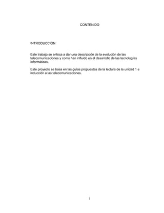 Este documento resume la evolución de las telecomunicaciones y su influencia en el desarrollo de las tecnologías de la información. Explica los orígenes de la red telefónica y cómo se desarrollaron las primeras redes de datos. También describe tecnologías clave como Ethernet, TCP/IP e Internet, así como conceptos importantes sobre redes como protocolos, tipos de redes, servicios de Internet y el modelo TCP/IP. Concluye enfatizando la importancia de comprender estas materias para desarrollar proyectos en ingeniería de sistem