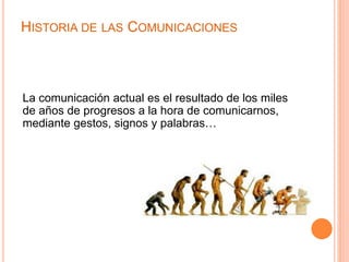 Este documento trata sobre la historia de las comunicaciones y las redes de computadoras. Explica que los primeros sistemas de comunicación modernos incluyen el telégrafo y el teléfono a través de cables, y luego la radio y la telefonía móvil sin cables. También describe los elementos básicos de una red, como los tipos de señales, topologías comunes y el modelo OSI de 7 capas para implementar protocolos de red. Finalmente, resume los principales servicios de Internet como la World Wide Web, las redes sociales y el correo electrónico.