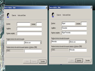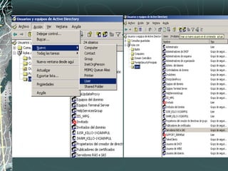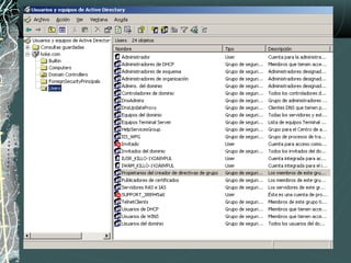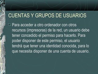 El documento explica la configuración de cuentas de usuario y grupos en una red local. Detalla los tipos de cuentas locales y de dominio, y cómo asignar permisos a grupos de usuarios. También cubre la planificación de nombres de usuario y contraseñas, y las propiedades y configuración de cuentas de usuario individuales, incluyendo la ubicación y tipos de perfiles de usuario.