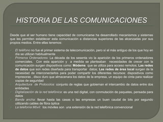 Este documento trata sobre la historia y fundamentos de las redes de computadoras. Brevemente describe la evolución de las telecomunicaciones desde los primeros sistemas hasta el desarrollo de las redes locales, Internet y la telefonía móvil. También resume los principales protocolos y conceptos involucrados como las capas OSI, topologías de red, cableado estructurado, control de acceso al medio y los protocolos TCP/IP.