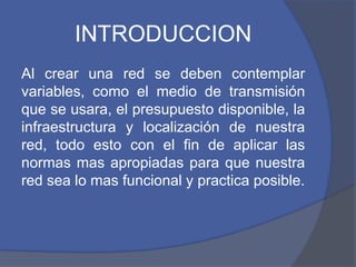 Este documento describe los diferentes medios de transmisión para redes, incluyendo cables guiados como par trenzado, coaxial y fibra óptica, así como medios inalámbricos como microondas y WiFi. Explica las ventajas e inconvenientes de cada medio y proporciona detalles técnicos sobre su funcionamiento y especificaciones.