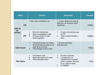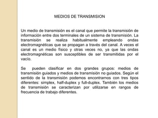 Este documento resume los diferentes tipos de medios de transmisión para redes locales, incluyendo medios guiados como par trenzado, cable coaxial y fibra óptica, y medios no guiados como microondas y ondas de radio. También describe los diferentes modos de transmisión como simplex, half-duplex y full-duplex.
