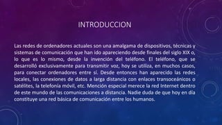 Este documento describe las redes de comunicación desde su origen en el teléfono hasta la actualidad. Explica los tipos principales de redes de datos como las redes de área local, metropolitana y extensa. También compara los modelos OSI y TCP/IP, indicando que ambos se basan en capas de protocolos de comunicación.