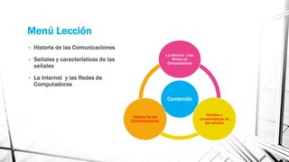 Este documento resume la historia de las comunicaciones desde el telégrafo y el teléfono hasta la actualidad, explica conceptos básicos sobre señales analógicas y digitales, y describe la evolución de Internet desde su creación como ARPANET hasta su uso masivo hoy en día.