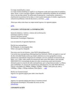 El documento habla sobre cómo aprender sobre las redes de área metropolitana (MAN) usando tecnología. Explica que las MAN son redes de alta velocidad que proveen servicios de datos, voz y video a través de fibra óptica o par trenzado en un área geográfica extensa. También describe varias estrategias y herramientas de aprendizaje como videos, mapas mentales, resúmenes y diagramas para analizar y sintetizar la información sobre las MAN.