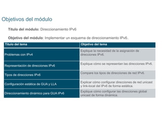 y/o sus filiales. Todos los derechos reservados. Información confidencial de Cisco Módulo de Práctica y Prueba ¿Qué aprendió en este módulo? • IPv4 tiene un máximo teórico de 4.3 billones de direcciones. • El IETF creó diversos protocolos y herramientas para ayudar a los administradores de redes a migrar las redes a IPv6. Las técnicas de migración se pueden dividir en tres categorías: Dual- stack, tunelización y traducción. • Las direcciones IPv6 tienen una longitud de 128 bits y se escriben como una cadena de valores hexadecimales. • El formato preferido para escribir una dirección IPv6 es x: x: x: x: x: x: x: x, donde cada "x" consta de cuatro valores hexadecimales. • Existen tres tipos de direcciones IPv6: unicast, multicast y anycast. • Las direcciones IPv6 unicast identifican de forma exclusiva una interfaz en un dispositivo con IPv6 habilitado. • Las direcciones IPv6 unicast globales (GUA) son globalmente únicas y enrutables en Internet IPv6. • Una dirección link-local IPv6 permite que un dispositivo se comunique con otros dispositivos con IPv6 habilitado en el mismo enlace y solo en ese enlace (subred). • El comando para configurar un GUA IPv6 en una interfaz es ipv6 address ipv6-address/prefix- length . • Un dispositivo obtiene una GUA dinámicamente a través de mensajes ICMPv6. Los routers IPv6 envían mensajes RA de ICMPv6 periódicamente, cada 200 segundos, a todos los