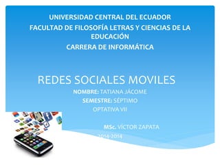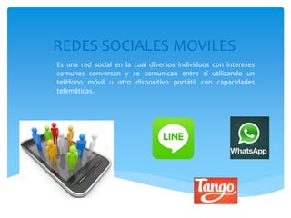 Este documento describe las redes sociales móviles y tres populares aplicaciones de mensajería: WhatsApp, LINE y Tango. WhatsApp permite a los usuarios crear grupos y enviar mensajes de texto, imágenes, videos y audio de forma gratuita. LINE incluye funciones como pegatinas y la capacidad de enviar varios tipos de archivos multimedia y hacer llamadas VoIP. Tango se enfoca en optimizar el uso de datos y realizar video-llamadas a través de Wi-Fi e Internet.