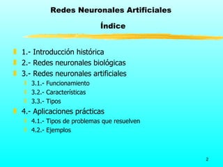 Este documento trata sobre las redes neuronales artificiales. Explica brevemente la historia de las redes neuronales desde los estudios pioneros en el cerebro en el siglo XIX hasta el desarrollo del algoritmo de retropropagación en la década de 1980 que revitalizó el campo. También describe el funcionamiento básico de las redes neuronales artificiales, sus características, tipos y aplicaciones prácticas como la optimización, el reconocimiento y la generalización.