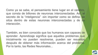 Las redes neuronales consisten en unidades de procesamiento interconectadas que aprenden a reconocer patrones. Se inspiran en el funcionamiento del cerebro y sus neuronas interconectadas. Pueden clasificarse en modelos biológicos o dirigidos a aplicaciones. Están compuestas de neuronas agrupadas en capas de entrada, ocultas y salida, y aprenden a resolver problemas complejos a través de la interacción entre sus neuronas.