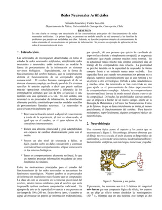 Este documento presenta las características principales de las redes neuronales artificiales. En primer lugar, introduce un modelo sencillo de red neuronal y cómo pueden modelarse diferentes tipos de problemas. Luego describe esquemas básicos de entrenamiento para reconocimiento de patrones. Finalmente, muestra un ejemplo de aplicación de redes neuronales al reconocimiento de texto.