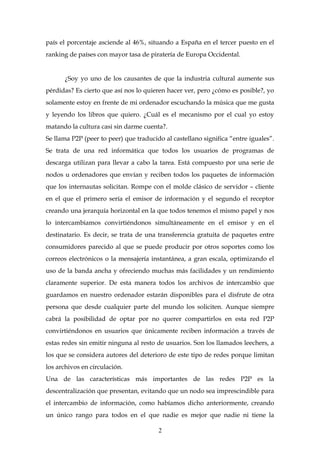 El documento discute el tema de la piratería y el uso de redes P2P. Explica que bajo la ley española, el uso personal de contenidos descargados de estas redes sin ánimo de lucro no es considerado un delito. Sin embargo, las industrias culturales argumentan que esto causa pérdidas económicas y está acabando con la cultura. El verdadero motivo de sus protestas es defender sus ingresos, no la cultura en sí. Se proponen alternativas como sistemas de descarga con pago de precios más b