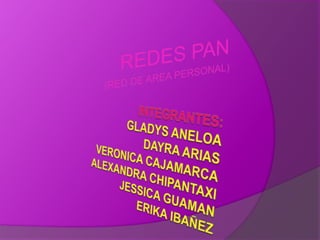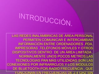 Este documento describe las redes personales inalámbricas (PAN), las cuales permiten la comunicación e intercambio de información entre dispositivos como computadoras, teléfonos y más dentro de un área limitada. Explica que las tecnologías PAN más utilizadas son conexiones por infrarrojos y Bluetooth en la frecuencia de 2.4 GHz. También describe que PAN representa redes centradas en las personas que les permiten comunicarse con sus dispositivos personales y conectarse al mundo exterior de forma inalámbrica.