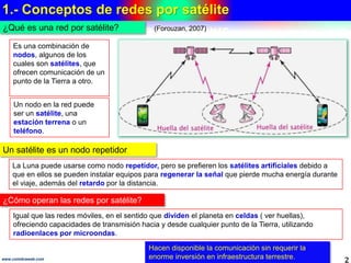 Este documento describe los conceptos básicos de las redes por satélite, incluyendo las órbitas de los satélites, los sistemas de comunicación por satélite y sus aplicaciones. Explica que una red por satélite consiste en nodos como satélites, estaciones terrenas y teléfonos conectados mediante radioenlaces por microondas. Describe las tres partes principales de un sistema de comunicación por satélite: el segmento espacial formado por el satélite, el segmento de control y el segmento terrestre. Finalmente, resume
