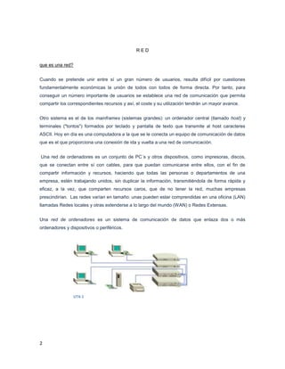Una red de ordenadores es un conjunto de dispositivos como PCs, impresoras y discos conectados mediante cables para compartir información y recursos. Las redes varían en tamaño desde redes locales (LAN) hasta redes extensas (WAN). Una topología de red común es la red en estrella, donde los nodos se conectan directamente a un punto central y todas las comunicaciones pasan a través de este. Cuando dos nodos intentan comunicarse simultáneamente puede ocurrir una colisión que es detectada e interrumpe las transmisiones hasta que