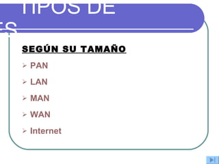El documento describe diferentes tipos de redes según su tamaño, topología y configuración. Explica PAN, LAN, MAN, WAN e Internet como tipos de redes según su tamaño, y redes en bus, estrella, anillo y celular según su topología. También describe dispositivos de red como tarjetas de red, cables, switches, routers, concentradores y servidores de impresión. Por último, cubre conceptos como protocolo TCP/IP, puerta de enlace, máscara de subred, DNS, DHCP y tipos de conexión