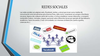 Este documento presenta una introducción a las redes sociales, describiendo sus características principales, ventajas y desventajas. Luego enumera las 10 redes sociales más populares en el país, incluyendo Facebook, Badoo, Flixster, Google Buzz, Hi5, MySpace, MyLife, Netlog, Twitter y Windows Live Spaces. Cada red social se describe brevemente, destacando sus funciones y objetivos.