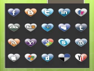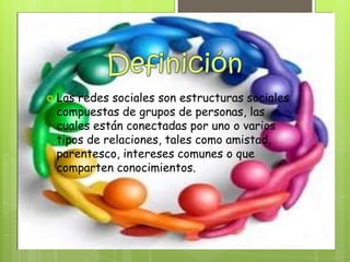 Las redes sociales pueden ser analógicas u online, y horizontales u verticales. Las redes horizontales no tienen un tema definido, mientras que las verticales se enfocan en un tema específico como profesiones, ocio o una mezcla. Algunas de las redes sociales más populares son Facebook, Twitter, LinkedIn y MySpace.