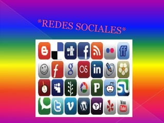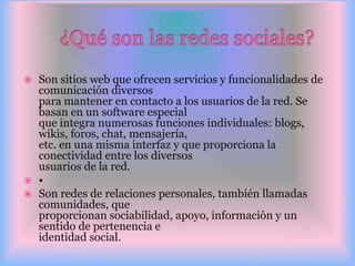 Las redes sociales son sitios web que ofrecen diversas funciones de comunicación como blogs, wikis, foros y chat para mantener a los usuarios conectados. Permiten la formación de redes de relaciones personales que brindan apoyo social e identidad grupal. Existen diferentes tipos de redes sociales clasificadas según su propósito, incluyendo redes personales como Facebook, redes temáticas y redes profesionales.