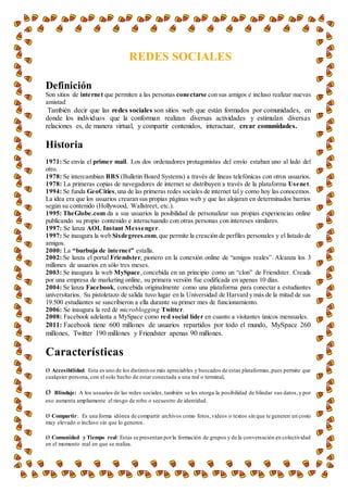 1978: Se intercambian los primeros sistemas de tablón de anuncios (BBS) a través de líneas telefónicas. 1995: TheGlobe.com permite a los usuarios publicar contenido y conectarse con otros. 2008: Facebook supera a MySpace como la red social líder. 2011: Facebook tiene 600 millones de usuarios, MySpace 260 millones, Twitter 190 millones y Friendster 90 millones. Las redes sociales permiten la accesibilidad, formación de comunidades en tiempo real, selección de contenido y variedad de plataformas para mant
