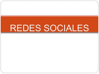 Las redes sociales son estructuras sociales compuestas de grupos de personas conectadas por amistades, intereses u otros tipos de relaciones. Se originaron en 1995 cuando Internet se masificó, permitiendo a Randy Conrads crear Classmates, una red para mantener contacto con antiguos compañeros. En 2003 surgieron sitios populares como MySpace, Friendster y Facebook que hicieron crecer exponencialmente el uso de redes sociales. Actualmente, las redes más importantes son YouTube, Facebook, Twitter, Yahoo Respuestas y otros.