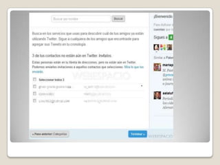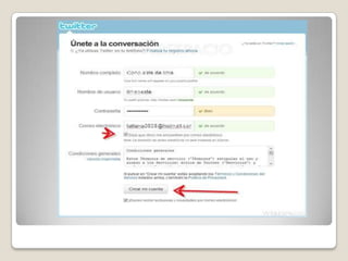 El documento proporciona instrucciones sobre cómo crear cuentas en varias redes sociales populares como Twitter, Myspace, Hi5 y Sonico. Explica los pasos básicos requeridos como ingresar datos personales, confirmar la cuenta de correo electrónico, personalizar el perfil con una foto y nombre de usuario, y comenzar a seguir amigos y usar las funciones básicas de cada plataforma.