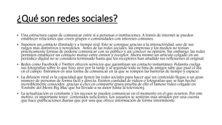 Las redes sociales permiten la comunicación entre personas e instituciones a través de Internet, creando comunidades con intereses comunes. Ofrecen contacto ilimitado y en tiempo real, así como difusión viral de contenidos. Las principales redes como Facebook y Twitter se usan para comunicación, marketing y entretenimiento.